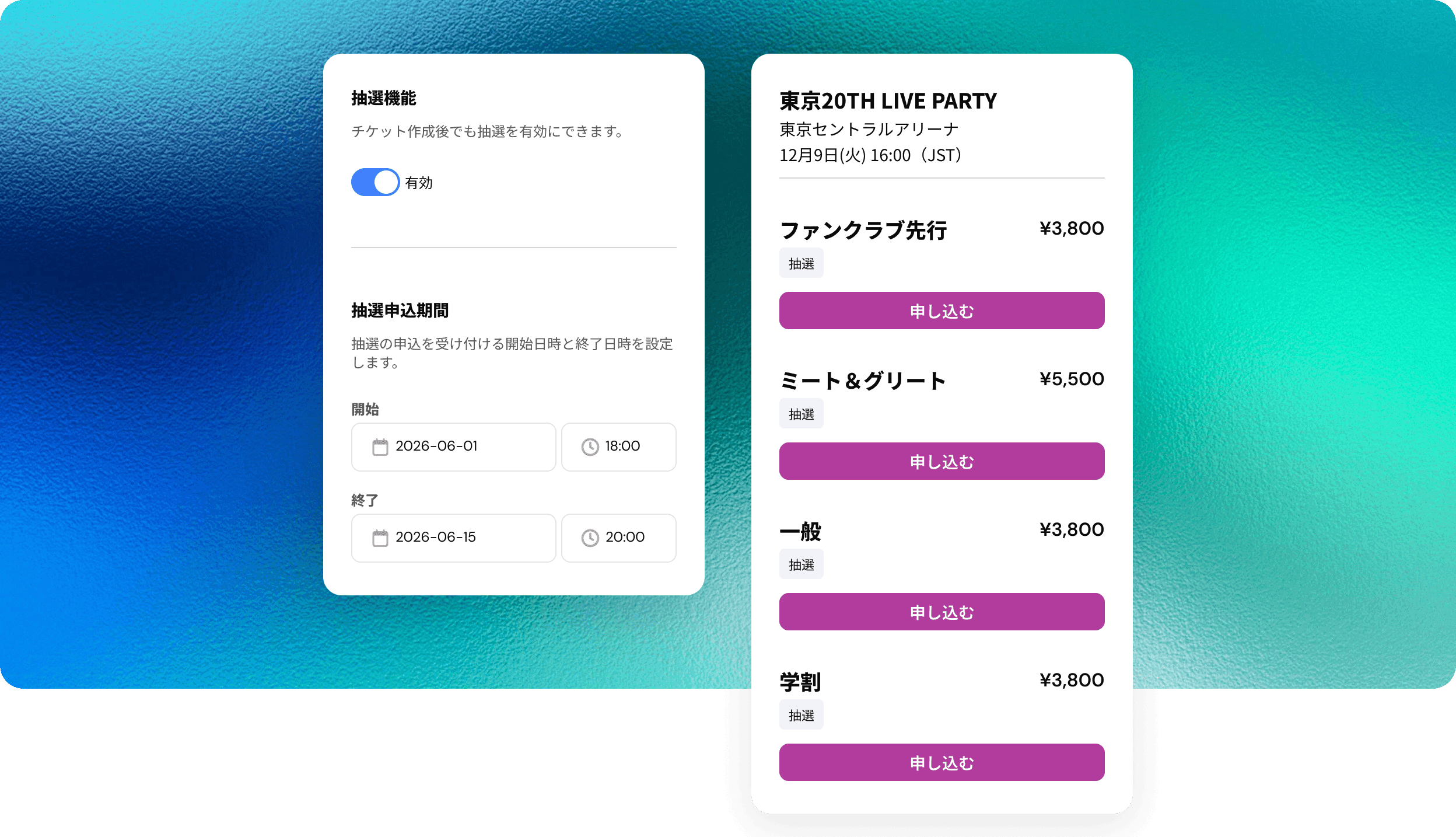 抽選形式でチケットを販売することができます。応募数や販売枚数を管理しながら、準備が整ったタイミングで当選発表・販売を行えます。
