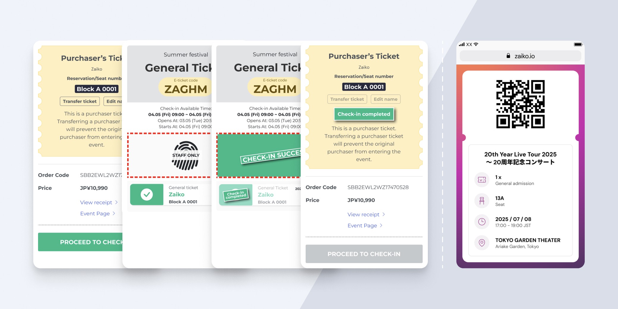 ZAIKOのQRコードおよびスワイプ式チェックイン機能で、入場をスムーズかつストレスフリーに。QRコードを瞬時にスキャンするか、カメラ不要のスワイプ方式で素早く認証できます。リアルタイム同期により、チケットのステータス、再入場の可否、ゲートごとの入場数をスタッフが常に正確に把握でき、会場全体で連携の取れた運営を実現。行列を短く保ち、スムーズな入場体験を提供します。