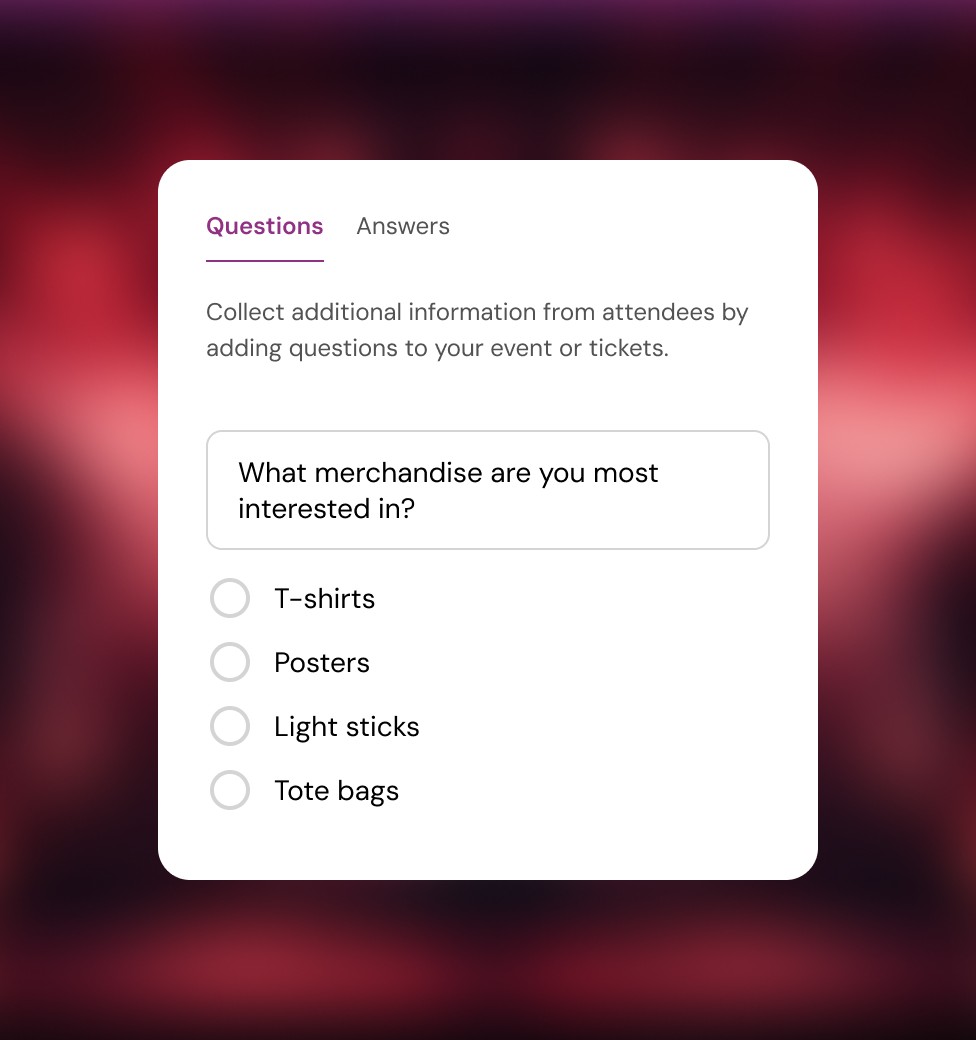 Collect the information you need before the event begins. Add custom questions to the purchase or application flow, gather attendee preferences or required details, and streamline operations, compliance, and fan engagement — all in one smooth workflow.