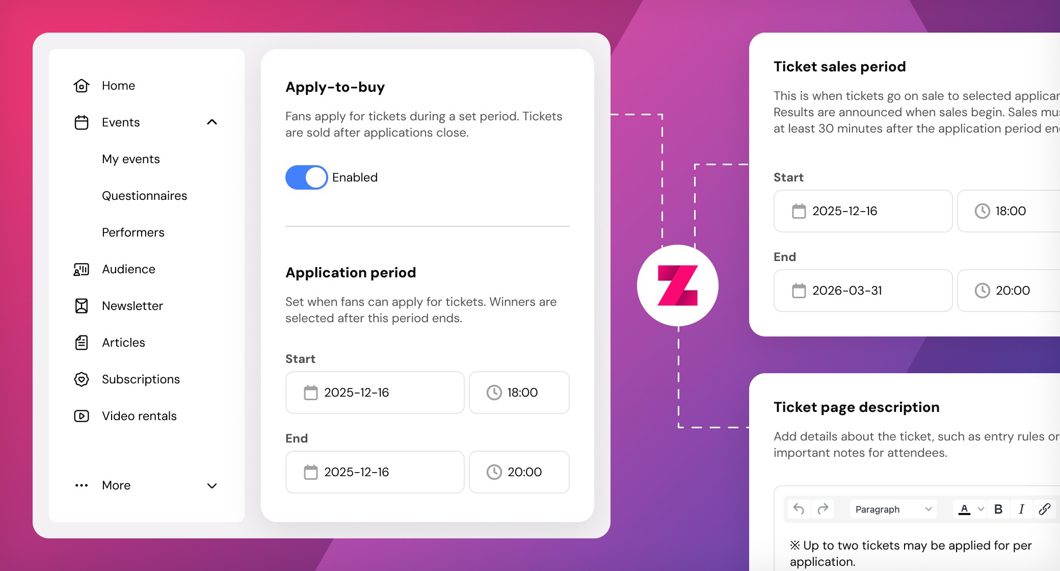 Zaiko makes high-demand sales effortless. Create apply-to-buy campaigns with automated application intake, fair and transparent selection, and instant winner notifications — all in one place. Perfect for exclusive merch drops, premium seating, pre-order events, and fan club releases.