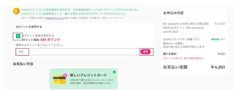 1. 『Zポイントを使用する』のチェックボックスをクリックし、付与されたZポイントを入力し、『適用』を押す。