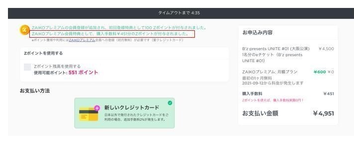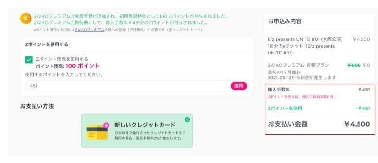 今回提供を開始した『購入手数料実質0円』の特典を利用するには、チケット購入時に購入ページで付与されるZポイントを、ユーザーご自身でお会計時に適用して頂くことが必要となります。ZAIKOプレミアム会員の場合、特典としてチケット購入時に毎回チケット購入手数料分のすぐに使用できるZポイントが付与されます。そのZポイントをお支払い時に使用いただくことで購入手数料が実質0円になります。ZAIKOプレミアムでは、ユーザーの皆様が、ライブ・エンターテイメントをより自由に、お得に楽しむことができる特典を拡充し続けてまいります。