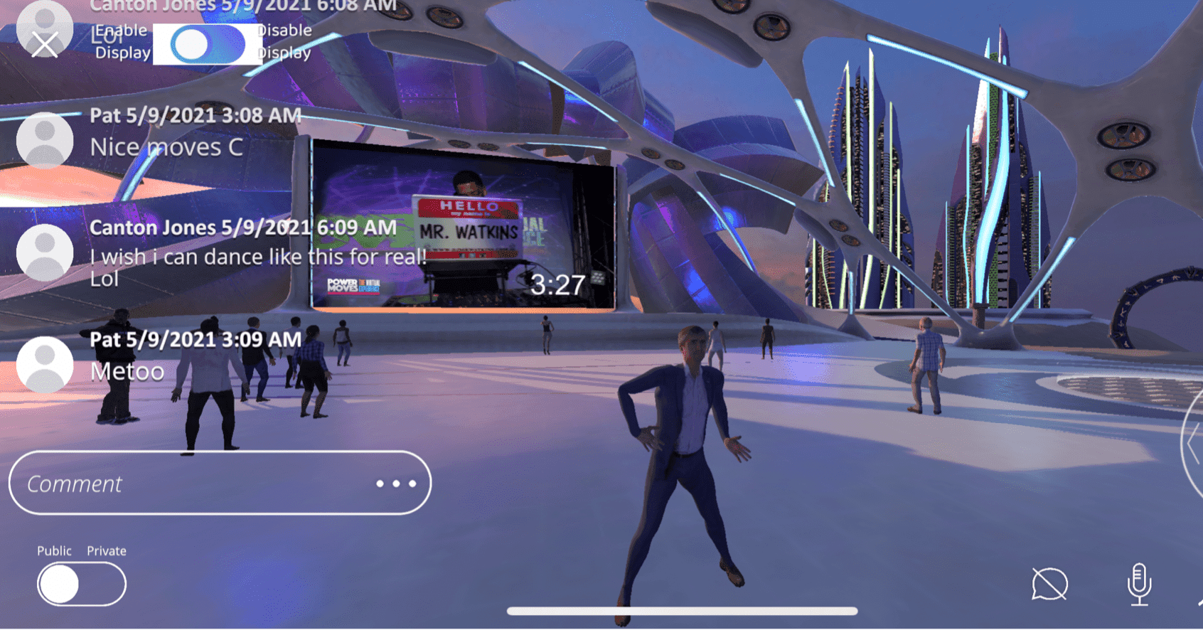 近くにいる人とチャットを楽しんだり、あらかじめ設定されているダンスムーブ(右下のボタン)で個性を発揮したり、操作はすぐに覚えることができます。なお、アプリ内の課金によってダンスムーブは追加することができます!まるでオンラインゲームのようですね!
