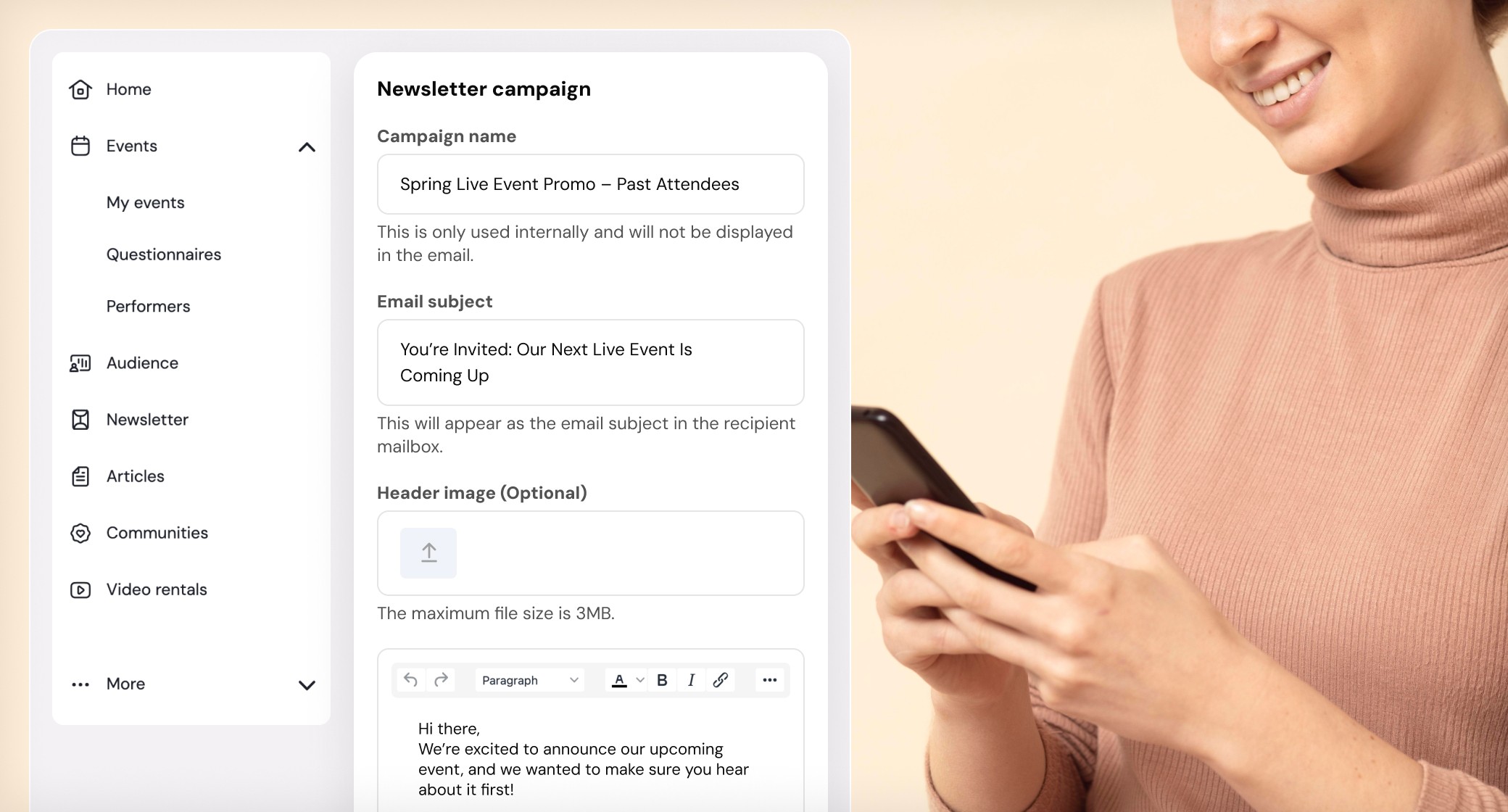 あなたのイベントに興味を示した人々にターゲットを絞ったニュースレターを送信します。新しい公演を宣伝し、最新情報を共有し、購入する可能性が最も高いファンの心に留まり続けましょう。